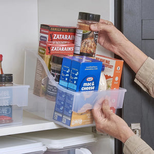 2 Tier design Durable Construction Open Top Design Clear Easy to see contents Heavy Duty easy front grip Fridge Bin Pantry Bin Closet bin