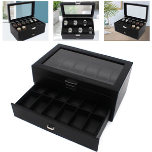 The watch box is made of high-quality wood, carbon fiber, glass, plastic, and zinc alloy, which is strong, durable, and not easy to deform. It has two layers with a total of 24 compartments and a lot of storage space, which can meet your daily storage needs.
