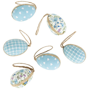 Note: Set of 6 includes; 2 blue plaid, 2 blue with hearts and 2 floral print eggs