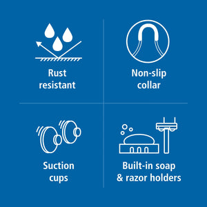 If a simple shower storage solution is what you seek, look no further than the Hanging Shower Caddy! This no-nonsense over-the-shower caddy provides an easy way to create convenient storage for your bath essentials. The rust-resistant metal caddy fits over any standard showerhead for easy, tool-free installation. A non-slip collar and included suction cups keep the caddy in place. Two wire shelves and a soap tray are complemented by a built-in razor holder/hanging storage hooks.
