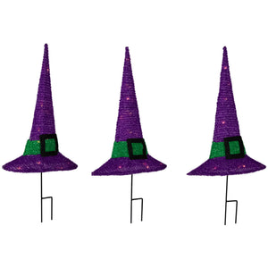 Get ready to cast a spellbinding atmosphere in your outdoor space with our witches hat Halloween decoration display! Each of the three hats stands tall on a sturdy stake, ensuring it remains steady amidst gusts of wind. The vivid purple hue adds a mystical charm while the classic pointed design pays homage to the timeless witch's attire. But the real magic begins when the sun sets and the night comes alive. Thanks to its battery-operated LED lights, simply switch it on, and watch as the captivating lights weave a spellbinding atmosphere around your home.