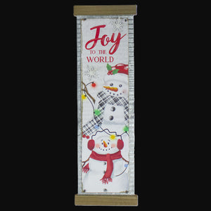This gorgeous wall art would be the perfect addition to your home for the Christmas season. It features a rustic galvanized metal backing with snowmen holding a string of Christmas lights designed on the front. It reads "Joy to the world". The wood trim against the metal back gives this piece a country farmhouse feel.