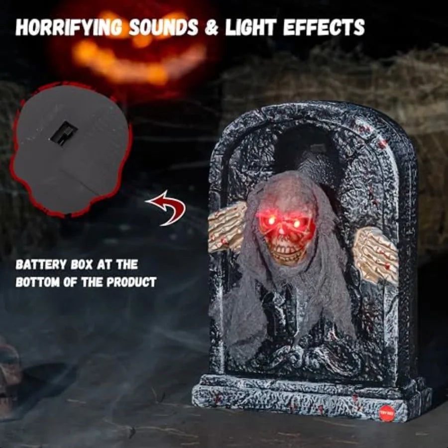 Light-Up Eyes: The skeleton (or tombstone) features terrifying light-up eyes that glow ominously in the dark for maximum visibility and fright.