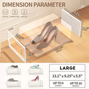 Large Size Shoe Box Upgraded wider and higher shoe organizer fit for larger shoes size . Unit size is 13.1L x 9.25 W x 5.5H, fits for womens shoes up to US size 11 and mens shoes up to US size 10.
