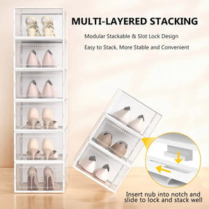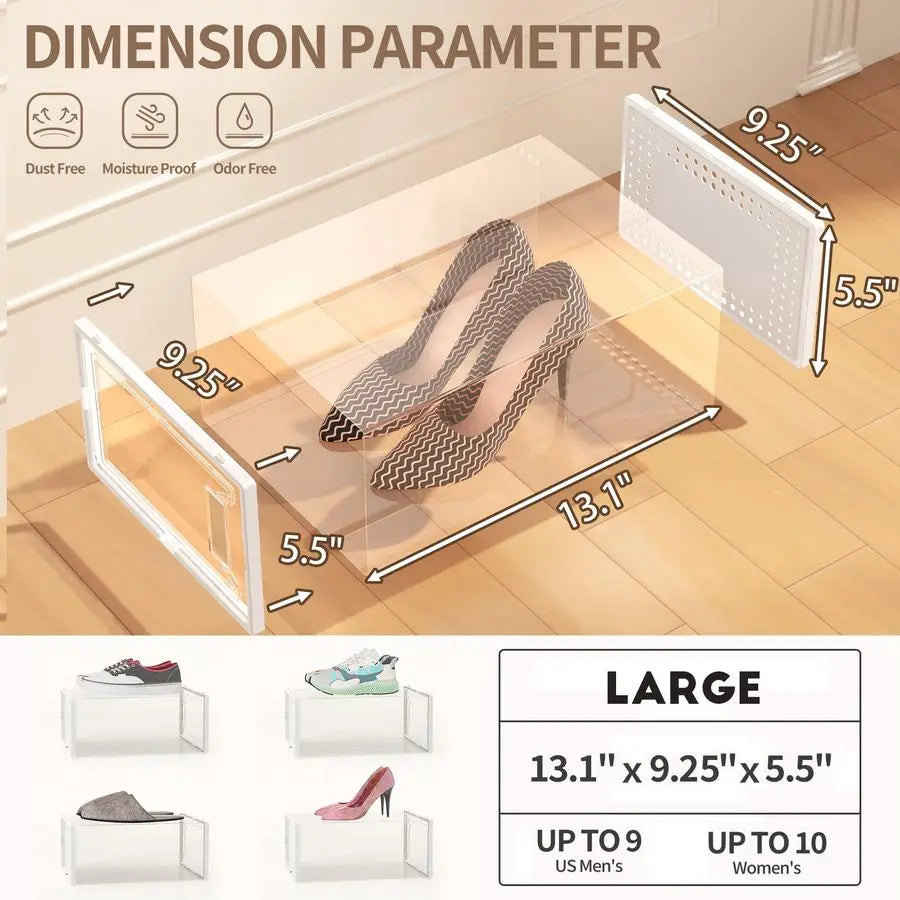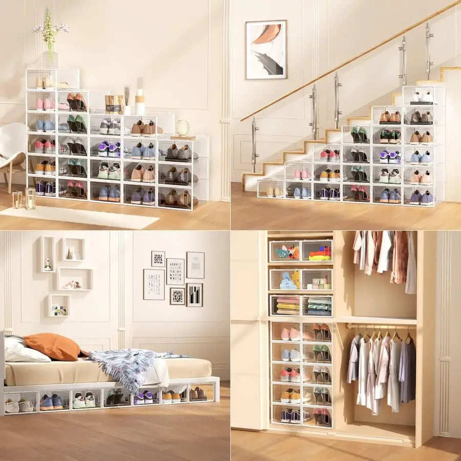 Clear Shoe Manager Clear shoe boxes stackable helps you search for your shoes quickly and efficiently, and ventilation design allows air circulation and odor prevention. Limited space saving fit for in the closet, wardrobe, hallway, entryway, bedroom, under bed and so on.