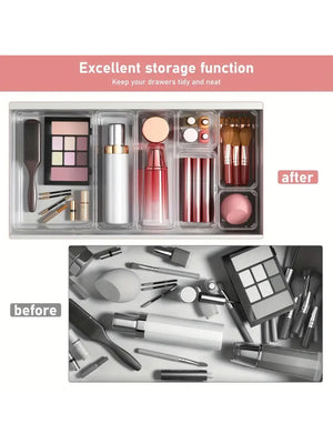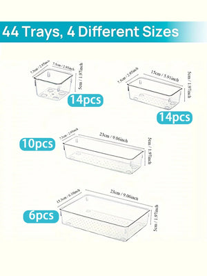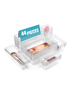 Tired of rummaging through messy drawers? This 44-piece drawer organizer set is the perfect solution for bringing order to your home. Designed to fit a variety of drawers, these clear plastic bins allow you to customize your storage and easily see everything at a glance. Ideal for organizing makeup, jewelry, office supplies, and more, this set helps you create a clean, clutter-free space.
