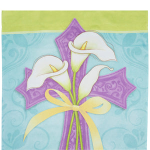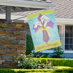 Celebrate Easter and spring with this "Easter Blessings" outdoor house flag. Featuring a purple cross and white lilies, this flag creates a reverent and seasonal display. Upgrade your outdoor decor with this house flag, welcoming guests and sharing your holiday spirit. This decoration provides a simple way to display your Easter greetings.