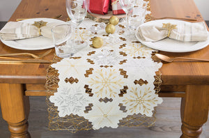 Featuring shimmering gold and silver embroidered snowflake motifs, this table runner is perfect for small tables. Whether used on its own or as an overlay on a solid tablecloth, it adds a festive sparkle to dining tables or mantels. Ideal for indoor use, this table runner is a beautiful accent for your holiday gatherings.