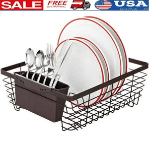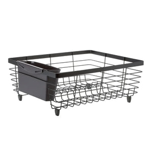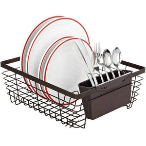 This kitchen details flat wire dish rack in holds up to 13 dishes . This rack is perfect for plates, bowls, mugs and more. Open Wire design helps water drain and tray underneath catches water. Comes with cutlery basket for utensils. Powder Coated design fits any kitchen decor.