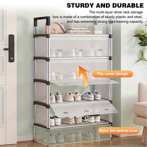 1.Sturdy and Solid: Our multilayer shoe rack storage box combines sturdy plastic and steel materials for exceptional load-bearing capacity. for organizing shoes efficiently.