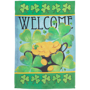 Depicts a pot of gold enveloped by shamrocks and gold coins with the message "Welcome" in black text