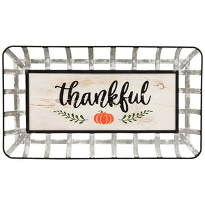 Add this wooden and metal wall sign to your fall decor! The sign is rectangular in shape that features a metal basket with a pumpkin and leaves in the center while reading "Thankful". This wall decor is a perfect addition to any empty space in your home for that special time of the year festivities.