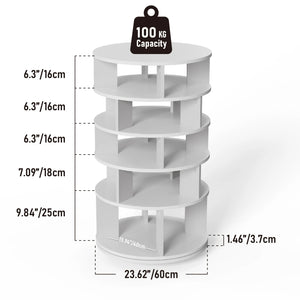 FUNCTIONALITY 360° rotation for easy access, 5 tiers capable of accommodating up to 20-24 pairs of shoes different heights to accommodate various types of footwear and other items.