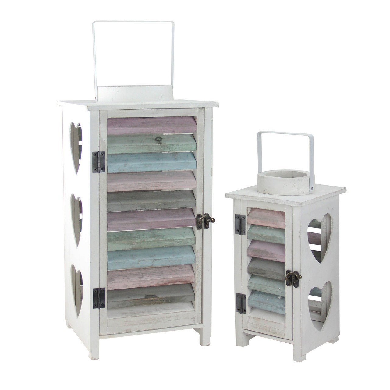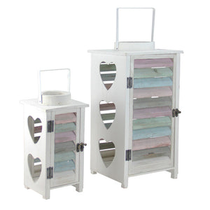 This beautiful set of 2 wooden lanterns feature weathered multicolored wooden shutters and heart cutouts that will add charm to any decor