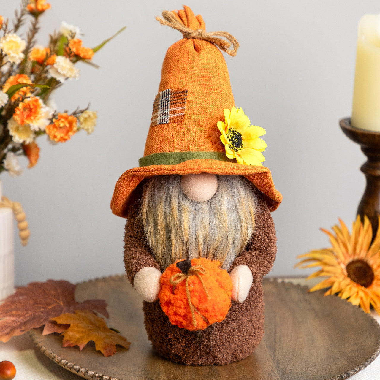 This adorable plush gnome makes the perfect fall decoration for your home or office. Featuring a soft faux beard, orange floppy brim pointed hat with a plaid patch, sunflower, and jute bow accent, this fall gnome captures the spirit of the season. Dressed in a cozy brown fleece outfit and holding a pumpkin, it’s designed with a weighted bottom for added stability. Ideal for tabletops, mantels, or shelves, this gnome decoration brings rustic charm to your Thanksgiving display.