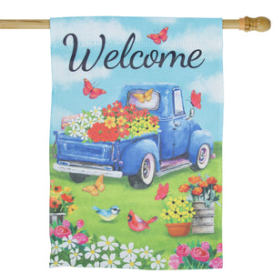 Welcome Pickup Truck with Flowers Decorative House Flag for Front Porch