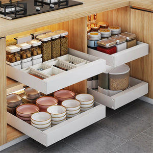 Space-Saving Design: Utilizes unused vertical space under your cabinet to neatly store items like spices, dishes, and bowls.