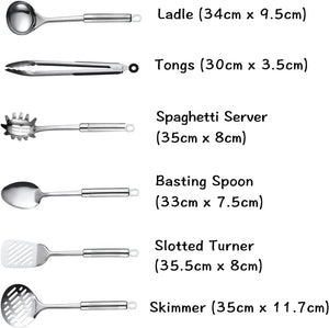 A PERFECT CHOICE FOR YOUR KITCHEN - Whisk (30.5cm x 7cm) /Spatula (30cm x 5cm) /Spaghetti Server (35cm x 8cm) /Asla Turner (35.5cm x 8cm) /Non-Slotted Turner (35cm x 10cm) /Slotted Turner (35.5cm x 8cm) /Skimmer (35cm x 11.7cm) /Slotted Serving Spoon (33cm x 7.5cm) /Basting Spoon (33cm x 7.5cm) /Ladle (34cm x 9.5cm) /Tongs (30cm x 3.5cm) /A Gift Box