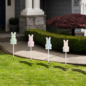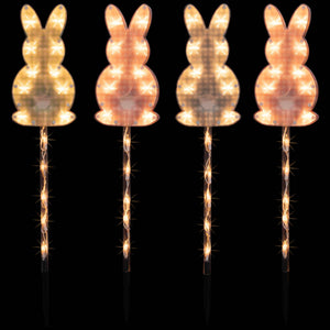 Make your Easter festivities pop with these pre-lit plaid Easter Bunny pathway marker lawn stakes. Perfect for adding a touch of whimsy to your outdoor decor. These adorable stakes feature charming bunny designs adorned in colorful plaid patterns. With built-in lights to illuminate your pathway. These stakes will delight guests of all ages as they hop along the bunny trail. Set includes four stakes to create a festive atmosphere in your yard or garden. Get ready to welcome the Easter season with style and charm!