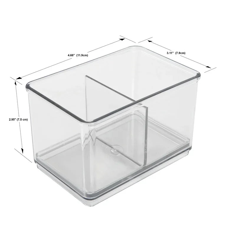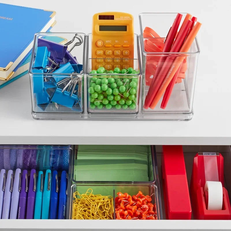 As seen on Netflix! Stackable modular bin design 1 Base Tray (9. 37 x 4. 68 x . 50), 1 Pencil Cup (3. 12 x 4. 68 x 4. 29), 1 Small Insert Bin (3. 12 x 4. 68 x 2. 95), 1 Small Insert Bin with removable divider (3. 12 x 4. 68 x 2. 95) Mix and match with other Storage Solutions