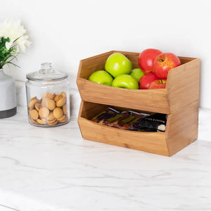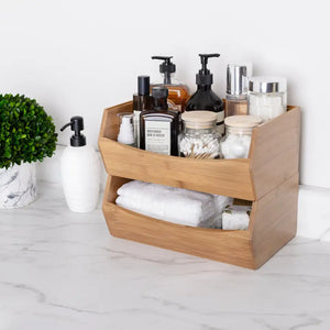 Elevate your organization with these versatile bamboo stacking boxes. Crafted from 100% sustainable bamboo with MDF laminated bases, these 12"W x 8"D x 5"H bins transform cluttered spaces into orderly environments. Perfect for junk drawers, pantry shelves, bathroom countertops, vanities, and garages, these eco-friendly organizers adapt to your specific storage needs while adding natural elegance to any space.