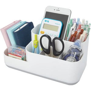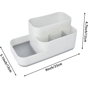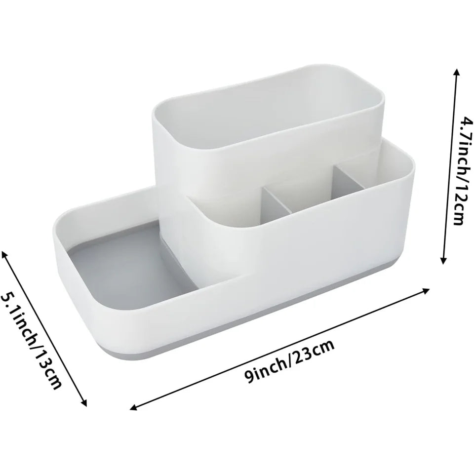 1. Keep your office supplies neat and organized with our versatile desktop organizer, featuring compartments for pens, pencils, cards, and more. This portable container is perfect for your desk or vanity table. Product dimensions: 5.1"D x 9"W x 4.7"H.