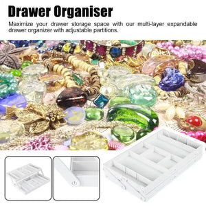 Organize your everyday must-haves with our multi-tier expandable drawer organizer. Featuring adjustable dividers, it's perfect for storing tools, cosmetics, jewelry, cutlery, and silverware. Sturdy enough for long-term use, it provides a strong carrying capacity.