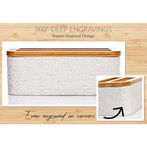 Engraved Ceramic Bread Box for Kitchen Countertop - Multipurpose Bread Storage Container with Thick Bamboo Cutting Board Lid - Elegant Bread Bin with Nature-Inspired Engraving - 13.8" x 7.9" x 5"