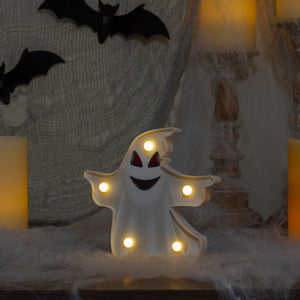 Illuminate your Halloween décor with this lighted Halloween ghost decoration, a playful yet spooky accent perfect for indoor or covered outdoor displays. Featuring a classic ghost silhouette, this wall or shelf decoration glows with super bright LED lights that give it a modern flair while maintaining the fun, eerie vibe of the season. The energy-efficient LEDs are built to shine all night long, making this a reliable centerpiece for Halloween parties, haunted house setups, or porch displays. Designed with convenience in mind, this lighted ghost marquee includes a built-in keyhole loop on the back, making it simple to hang on a wall, door, or anywhere you want to add glowing charm. The lightweight design allows for easy mounting and repositioning, so you can customize your spooky setup with ease. Whether you're creating a haunted entryway, decorating a child's Halloween party, or adding to your festive home décor, this LED light-up ghost sign is the perfect finishing touch. Combine it with pumpkins, spider webs, skeletons, and other Halloween lights for a complete themed display. Add a glowing dose of frightful fun to your seasonal setup with this eye-catching and energy-efficient Halloween marquee decoration.